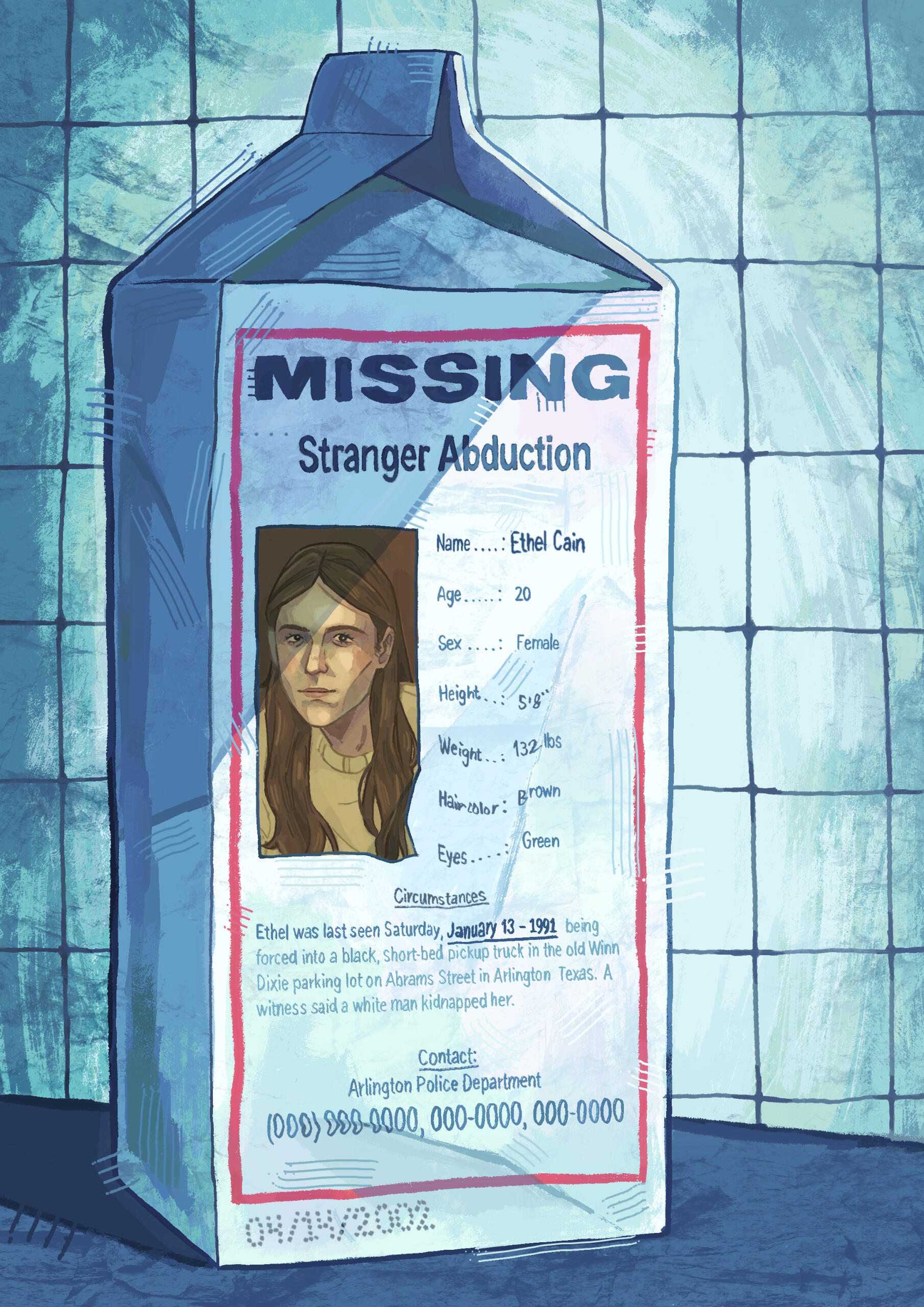 Ethel Cain’s song “strangers” tells the story of a girl who was kidnapped and cannibalised by her boyfriend in 1991. One of the lyrics inspired me to make an illustration based on this story. The story behind the image is so heartbreaking all the while the simple milk carton is something that you see on the daily, and those conflicting emotions are very interesting to me.